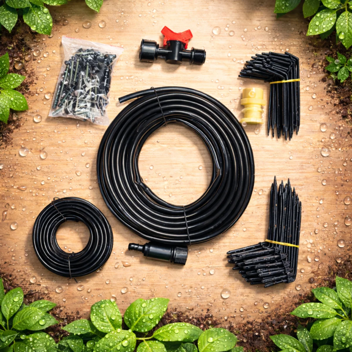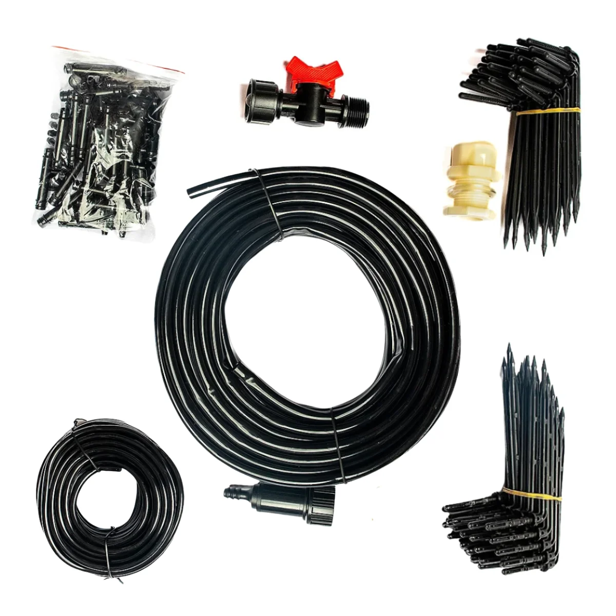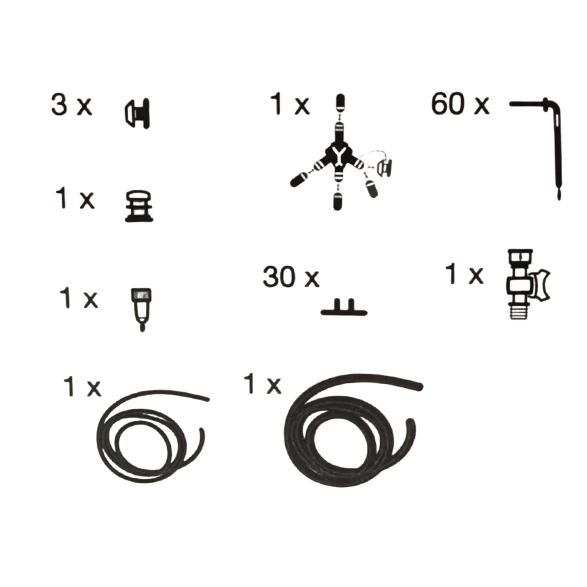 Zestaw zawiera wszystkie niezbędne elementy do samodzielnego montażu: elastyczne rurki, rozdzielacze, kroplowniki.