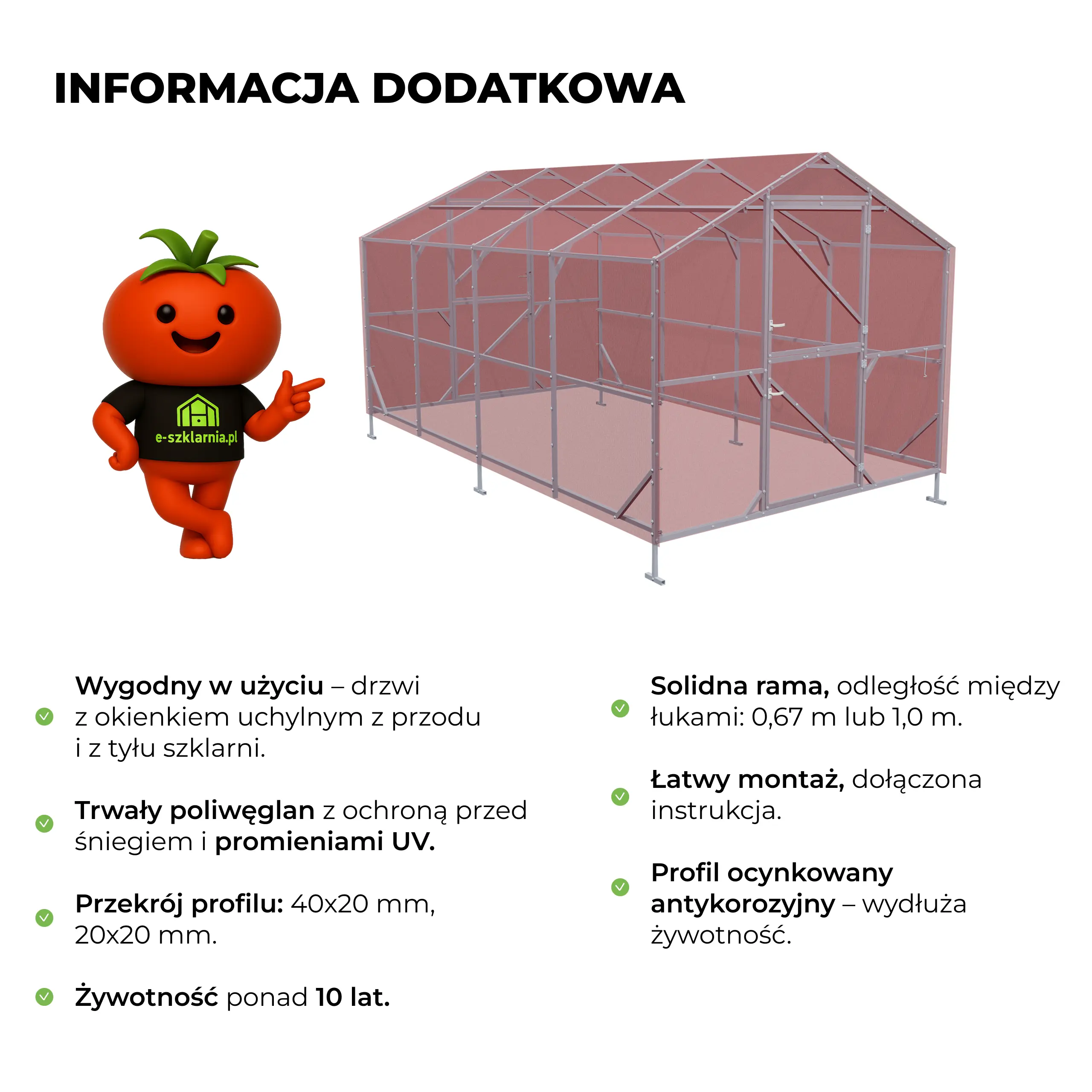 Nowoczesna i łatwa w montażu konstrukcja wykonana ze stali 0,8 mm ocynkowanej ogniowo z obu stron. Łuki wykonane z jednego elementu – są wygięte, fronty są spawane. W komplecie są kotwy w kształcie litery ”T” do montażu do gruntu oraz komplet śrub. Poszycie wykonane jest z poliwęglanu komorowego odpornego na promieniowanie UV.