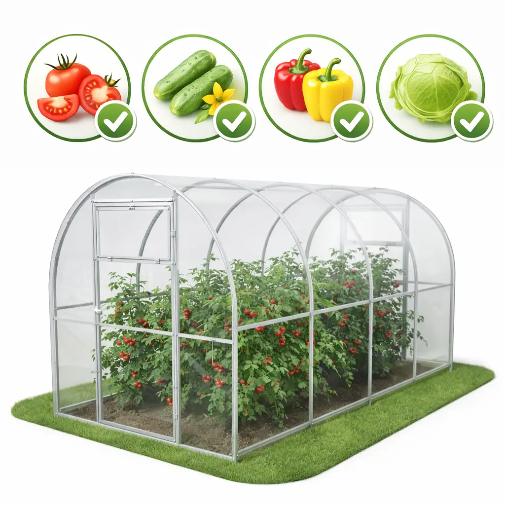 To kompaktowa konstrukcja o powierzchni 8 m², odpowiednia do niewielkiej działki i sezonowej uprawy roślin.