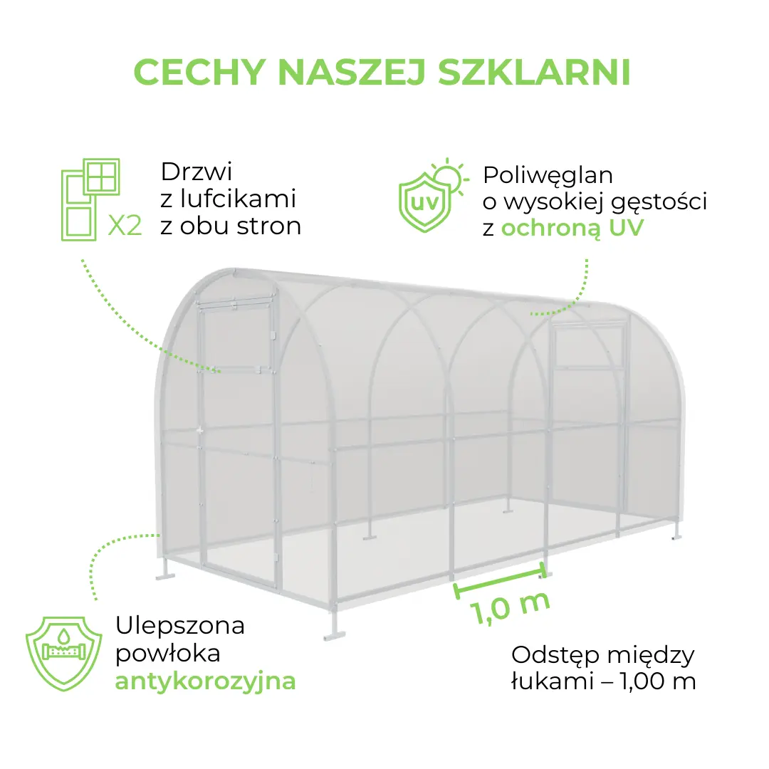 Nowoczesna i łatwa w montażu konstrukcja wykonana ze stali 0,8 mm ocynkowanej ogniowo z obu stron. Łuki wykonane z jednego elementu – są wygięte, fronty są spawane. W komplecie są kotwy w kształcie litery ”T” do montażu do gruntu oraz komplet śrub. Poszycie wykonane jest z poliwęglanu komorowego odpornego na promieniowanie UV.